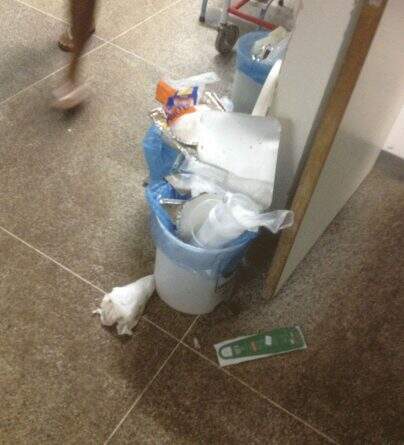 Nas imagens, pacientes do Hospital Regional de Taguatinga recolhem o lixo espalhado pelo chão. Fotos revelam lixeiras cheias e a sujeira dos banheiros.