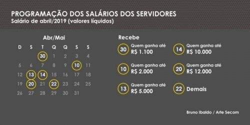 No próximo dia 10 serão depositados os salários de quem recebe até R$2.000 e dia 13 vai ser a vez dos que tem salário líquido de até R$5.000,00. Por sua vez, os vencimentos de quem recebe até R$10 mil serão pagos no dia 14 e de quem recebe até R$12 mil no dia 20. A quitação total dos salários está prevista para o dia 22 de maio.