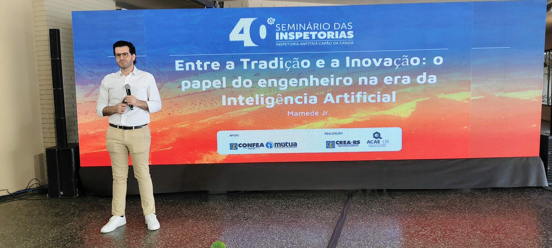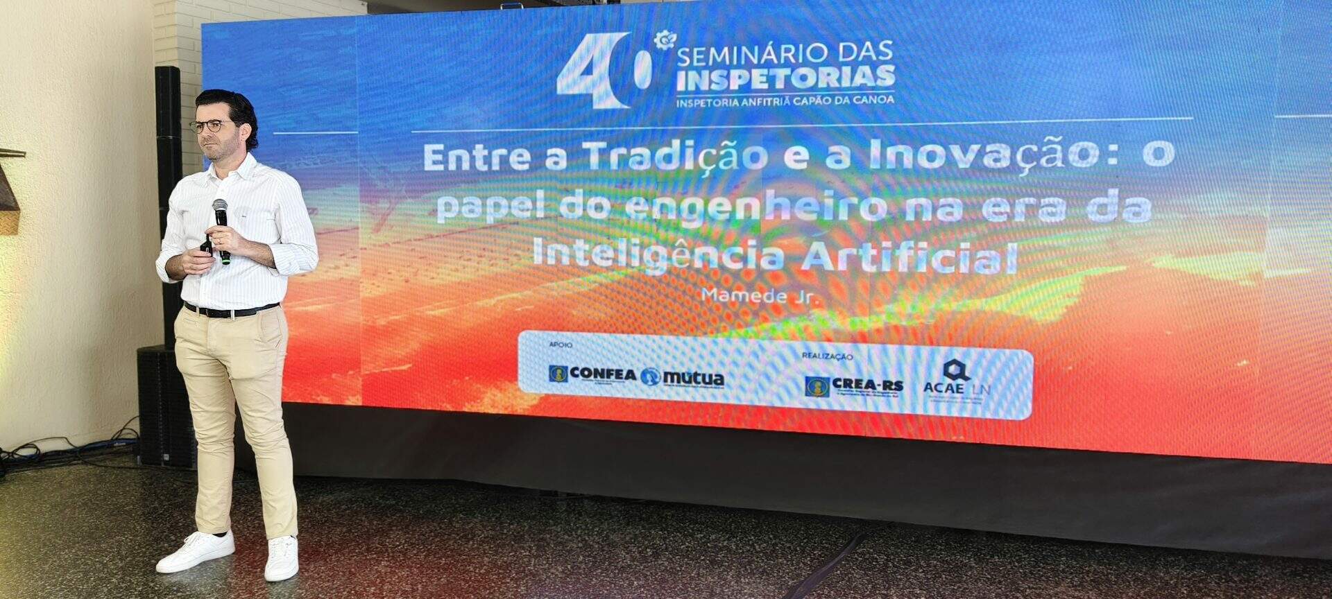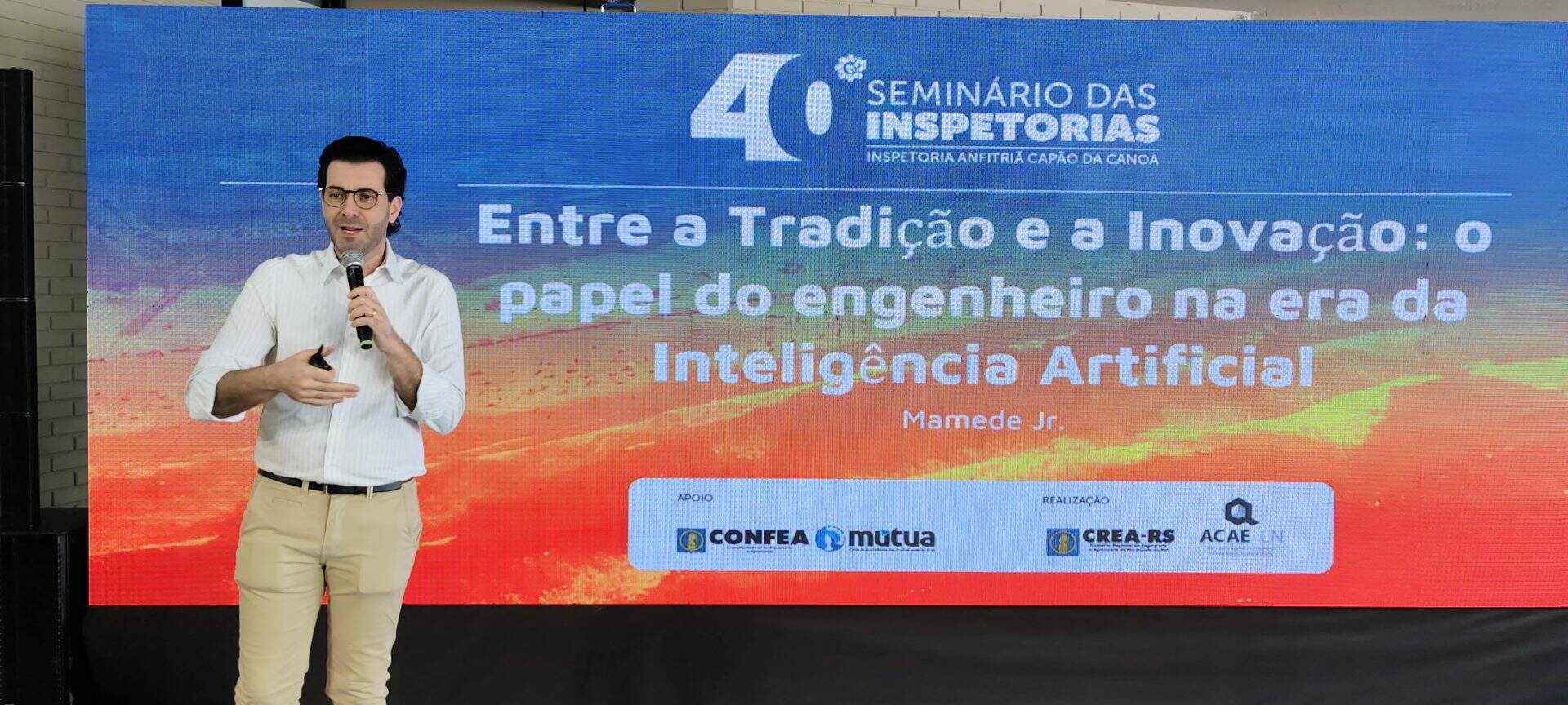 Antes do painel de encerramento, o seminário contou com uma apresentação especial sobre inteligência artificial aplicada às engenharias, conduzida pelo engenheiro civil e de produção Mamede Abou Dehn Junior. Com o tema “Entre a Tradição e a Inovação: o Papel do Engenheiro na Era da Inteligência Artificial”, Mamede trouxe reflexões sobre como a IA está transformando o mundo do trabalho e abrindo novas possibilidades para os profissionais da engenharia.