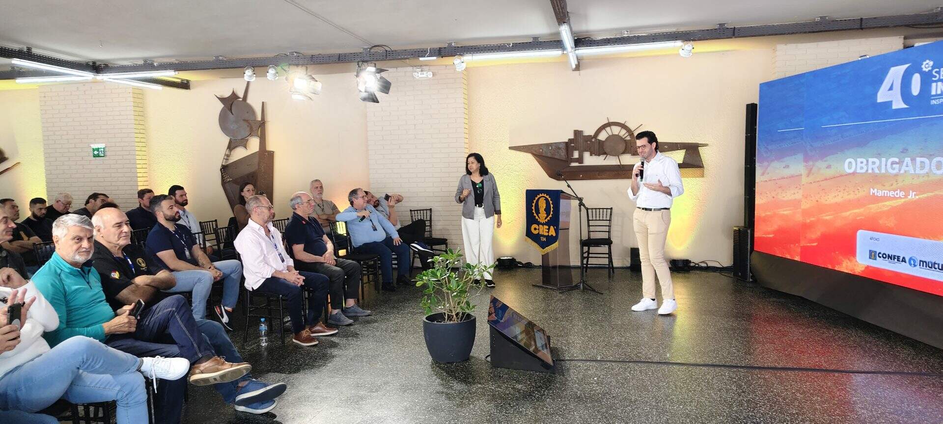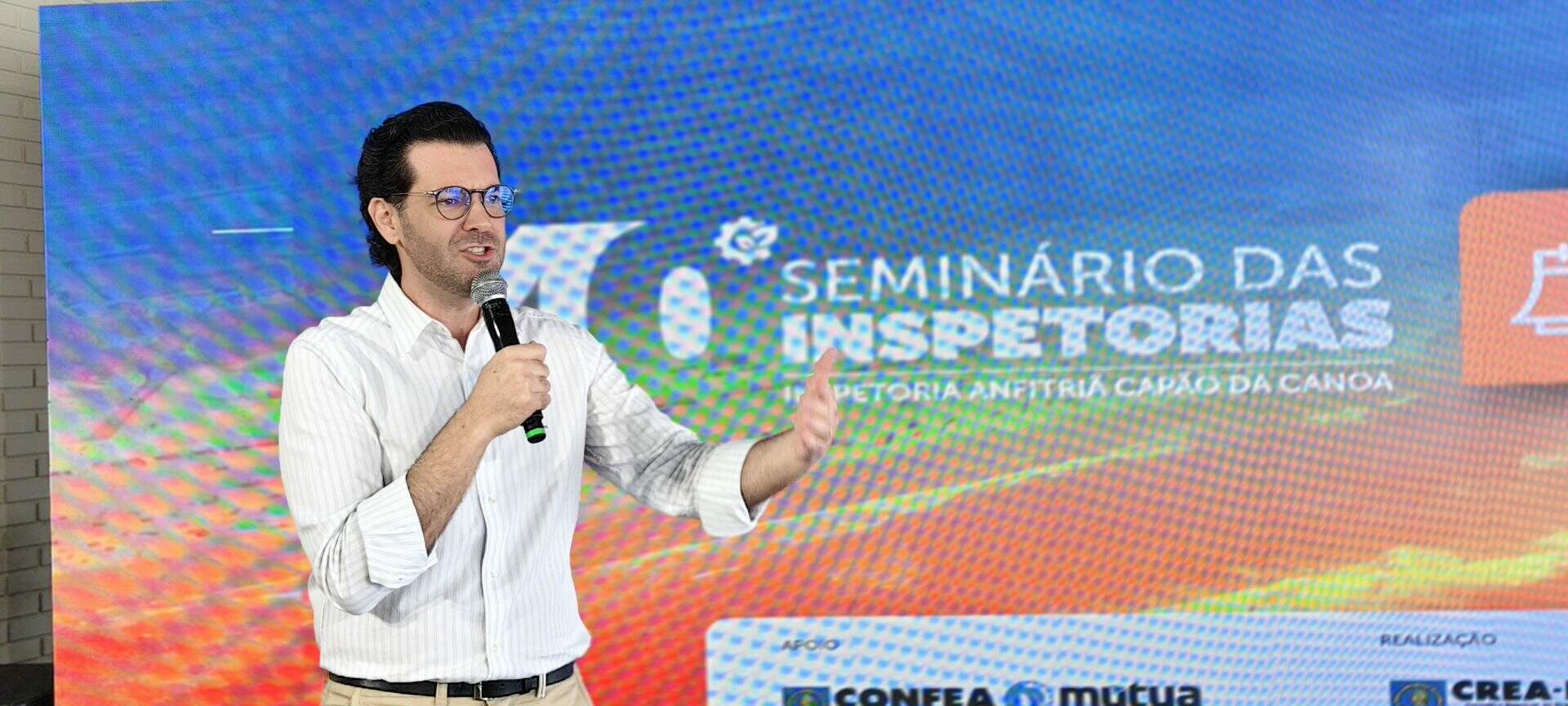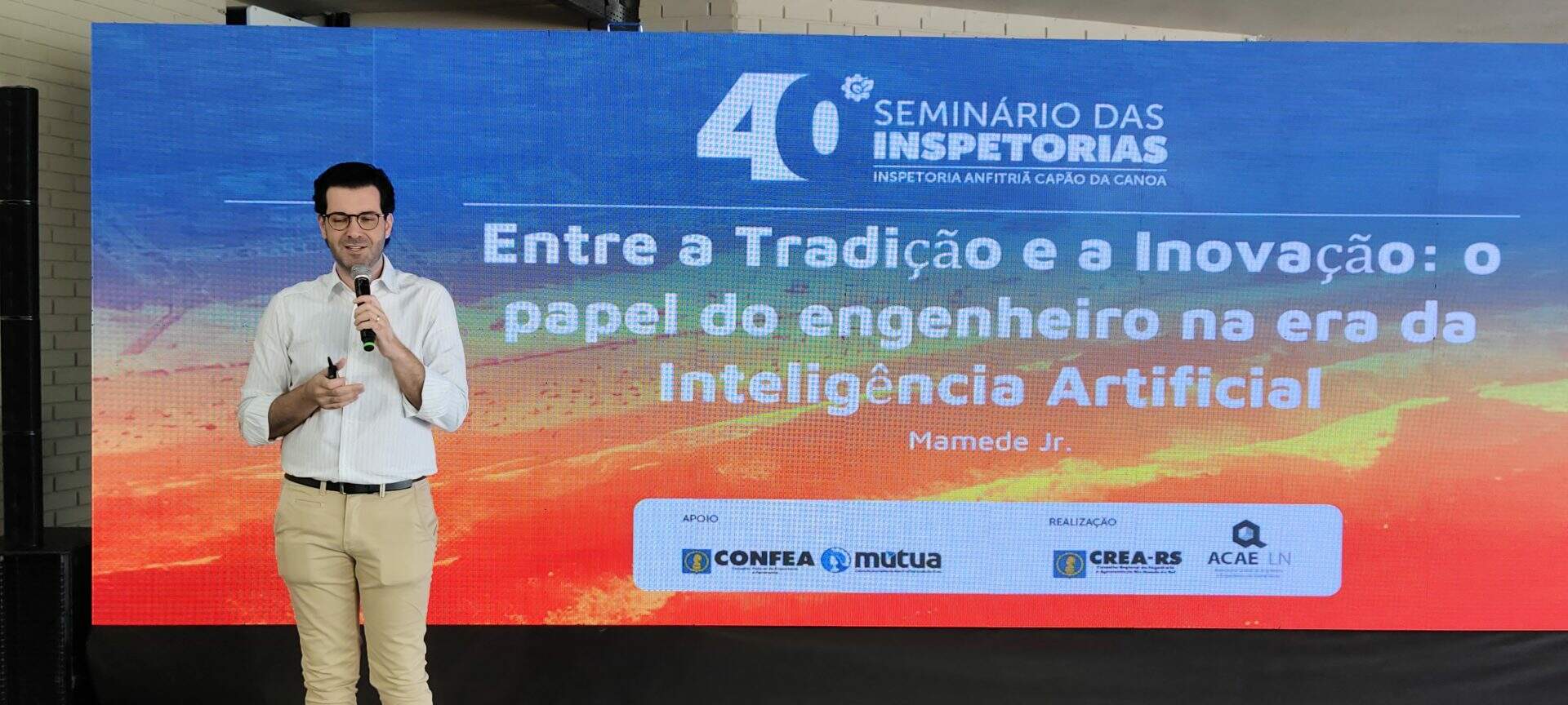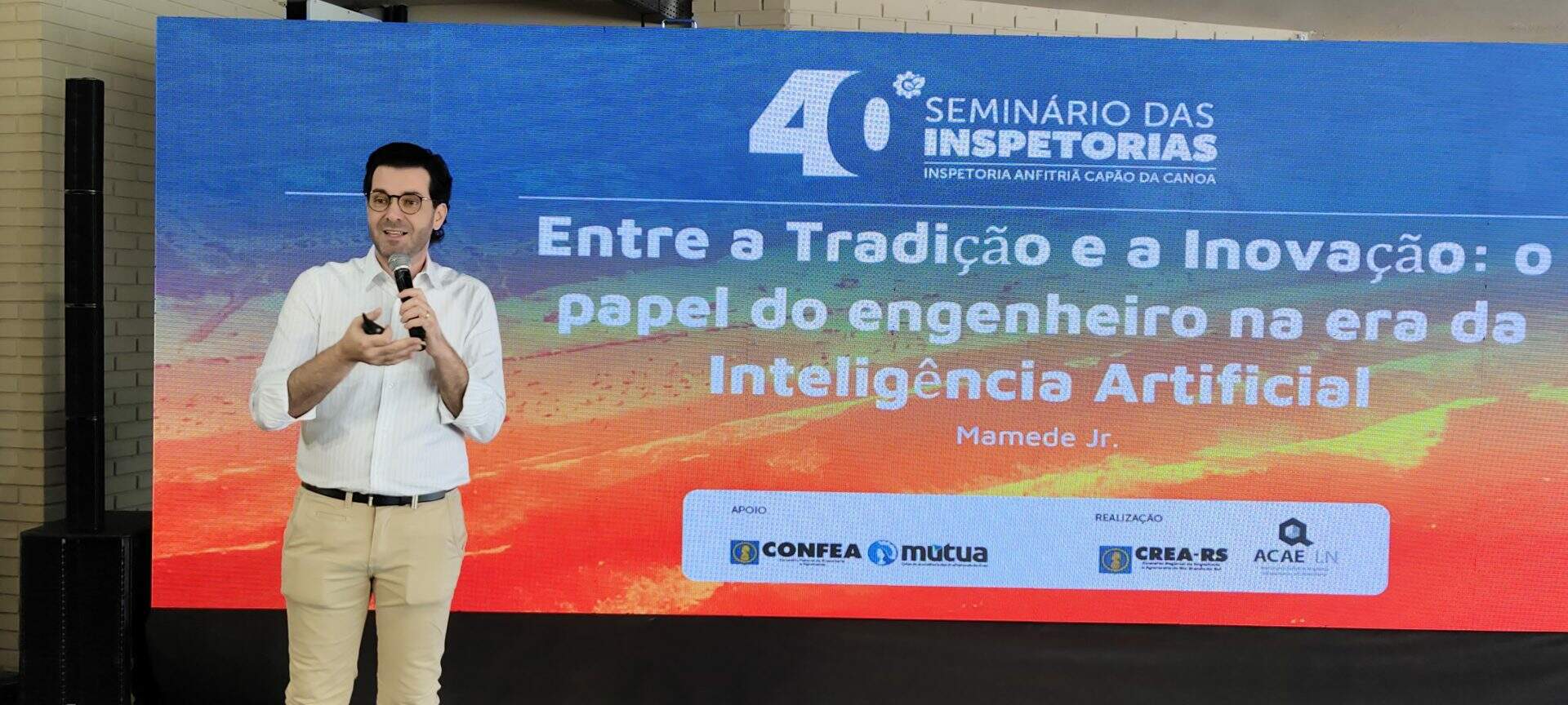 Antes do painel de encerramento, o seminário contou com uma apresentação especial sobre inteligência artificial aplicada às engenharias, conduzida pelo engenheiro civil e de produção Mamede Abou Dehn Junior. Com o tema “Entre a Tradição e a Inovação: o Papel do Engenheiro na Era da Inteligência Artificial”, Mamede trouxe reflexões sobre como a IA está transformando o mundo do trabalho e abrindo novas possibilidades para os profissionais da engenharia.