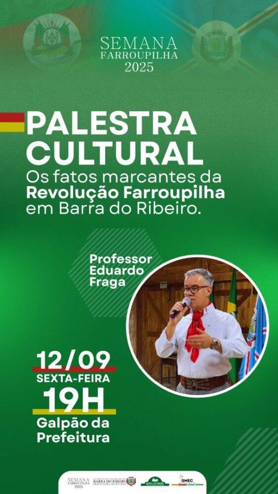 A Semana Farroupilha 2025 em Barra do Ribeiro terá como um de seus pontos altos a realização de uma palestra cultural que promete resgatar episódios históricos ligados à Revolução Farroupilha. O encontro será realizado na sexta-feira (12), às 19h, no Galpão da Prefeitura, e terá como palestrante o professor Eduardo Fraga.