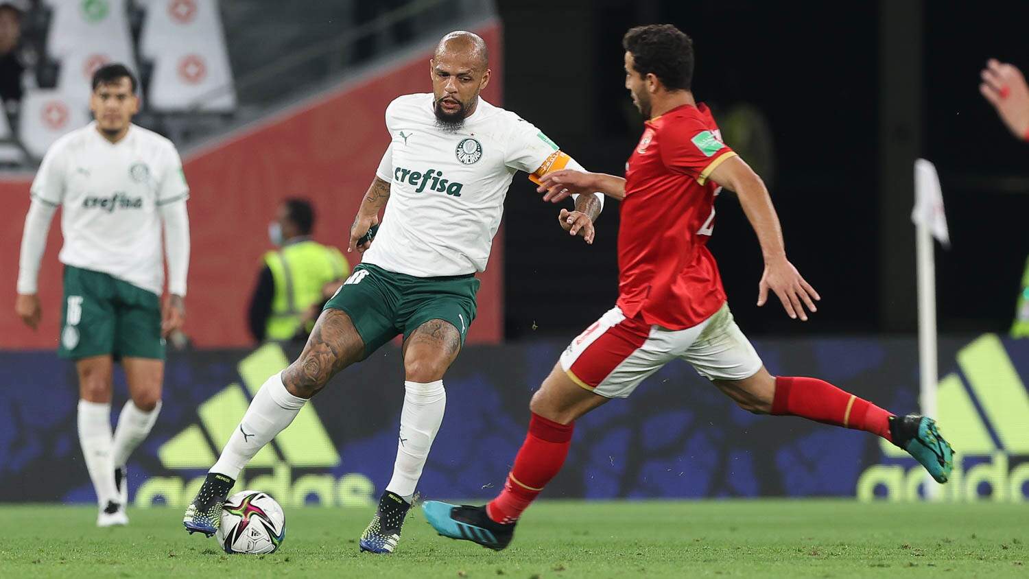 O jogador Felipe Melo, do Palmeiras, em disputa de bola com jogador do Al Ahly.