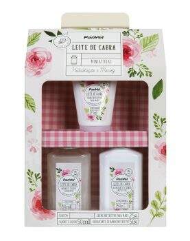 O Kit Miniaturas Leite de Cabra deixa a pele perfumada e macia, devido aos ingredientes suaves da proteína do leite de cabra. O kit contém 1 sabonete líquido, 1 creme nutritivo para mãos e um hidratante para banho.