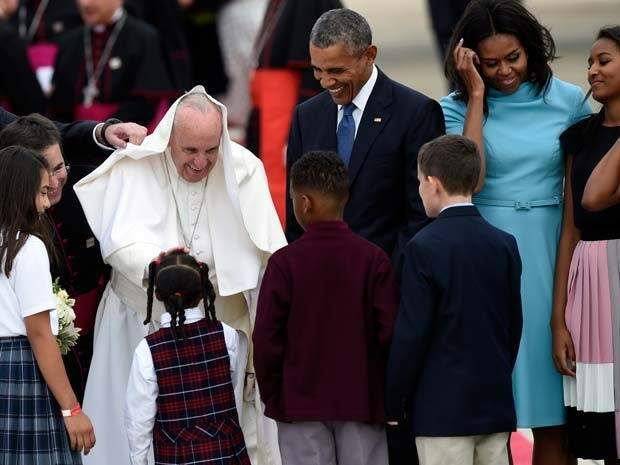 O Papa Francisco foi recepcionado pelo presidente norte-americano Barack Obama e sua família ao desembarcar, por volta das 16h45min desta terça-feira (22, horário de Brasília) na base Andrews, em Maryland, que serve a capital Washington D.C. O líder católico deixou a base naval em um Fiat 500 com uma placa SCV-1, que é usada em diferentes veículos para identificar o Papa Móvel. A abreviação “SCV” significa “estado da Cidade do Vaticano”.
