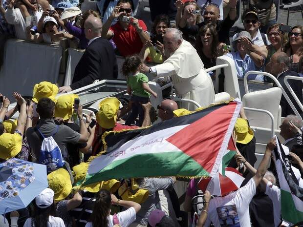 O pontífice pronunciou a reza na Praça de São Pedro do Vaticano, e não da janela do Palácio Apostólico, como costuma fazer aos domingos, porque foram levadas ao altar as primeiras santas palestinas da época moderna.