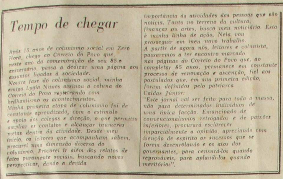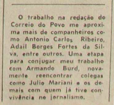Um dos bons momentos da atividade como jornalista foi receber a incumbência de fazer uma página dominical para o Correio do Povo, junto com o então editor, Armando Burd. Ouvi a liberação do chefe, Breno Caldas, para preparar a estreia no domingo, 09 de março de 1980. O Correio do Povo mantinha uma crônica assinada pela querida colega Lygia Nunes, com comentários a respeito dos diversos setores da vida da capital e outras cidades dos pampas.
