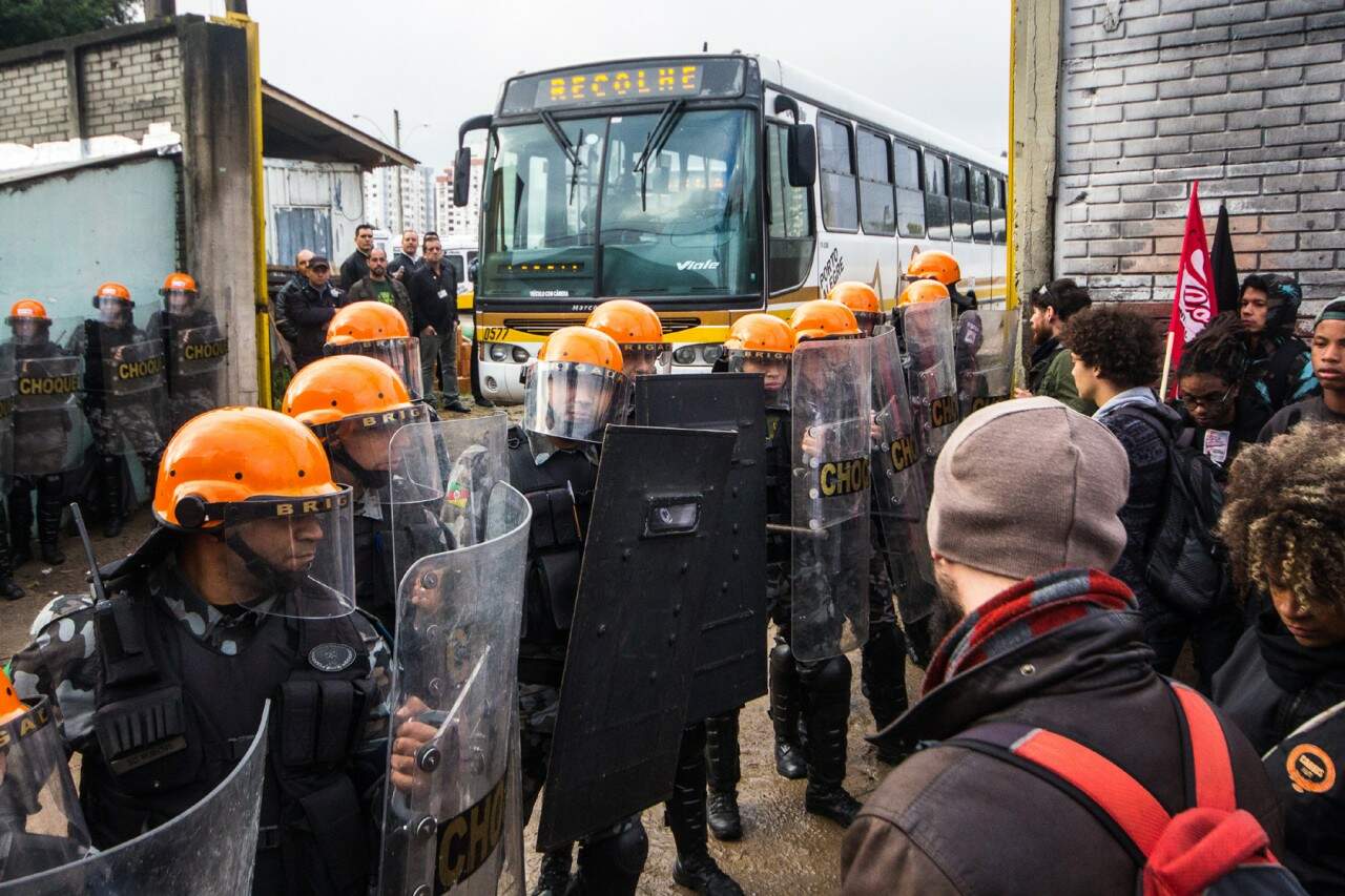 Após negociação tensa, veículos deixaram a garagem por volta das 8h30min (Foto: Jackson Ciceri/O Sul)