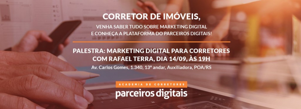 A internet já é a principal ferramenta utilizada pelos clientes na hora de buscar um imóvel. Com o objetivo de orientar o corretor a se destacar no mercado imobiliário, o Parceiros Digitais promove palestra sobre Marketing Digital, com o especialista, Rafael Terra. O encontro, gratuito, ocorre dia 14 de setembro, às 19h, no auditório do Centro Profissional Érico Veríssimo (Av. Carlos Gomes, 1.340). Inscrições podem ser feitas em: http://bit.ly/eventoparacorretores.