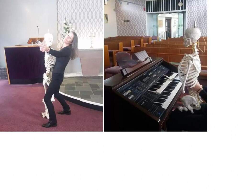 A pastora Angela Riding, que conduz cerimônias funéreas, e mais três funcionários foram afastados do crematório público de Preston (Inglaterra) após ela postar fotos no Facebook em que os quatro aparecem brincando com um esqueleto. As fotos foram feitas antes de uma cerimônia de despedida de um morto. O esqueleto havia sido levado à capela pela própria família do falecido, que queria um velório com humor, respeitando o jeito de ser do parente.