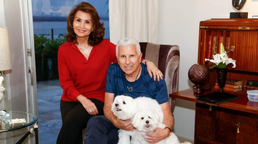 Waleska Santos e o marido, Francisco Santos, com os pets Blue e Bella. Apoveitam o final de ano no apartamento do Morro Santa Teresa inteiramente renovado. (Foto: Lenara Petenuzzo/especial)