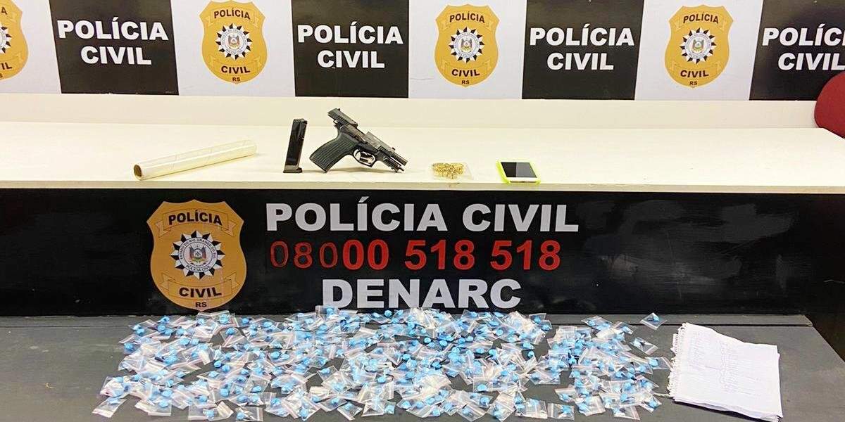 Foto: Polícia Civil/DivulgaçãoA Polícia Civil apreendeu cerca de 800 papelotes de cocaína, já prontos para a venda, nesta segunda-feira (21) em Cachoeirinha, na Região Metropolitana de Porto Alegre. Houve ainda a apreensão de uma pistola calibre nove milímetros com numeração suprimida e 16 munições, um telefone celular e material para acondicionar entorpecentes.