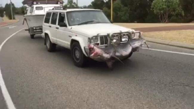 Um vídeo flagrou um pescador andando com um enorme tubarão-tigre pendurado na parte dianteira de seu carro em Safety Bay, um subúrbio a sul exterior da cidade de Perth, na Austrália. A ação revoltou os usuários das redes sociais. Gravadas por Julie Wright, as imagens mostram o veículo circulando por uma avenida movimentada enquanto o animal está amarrado no para-choque.