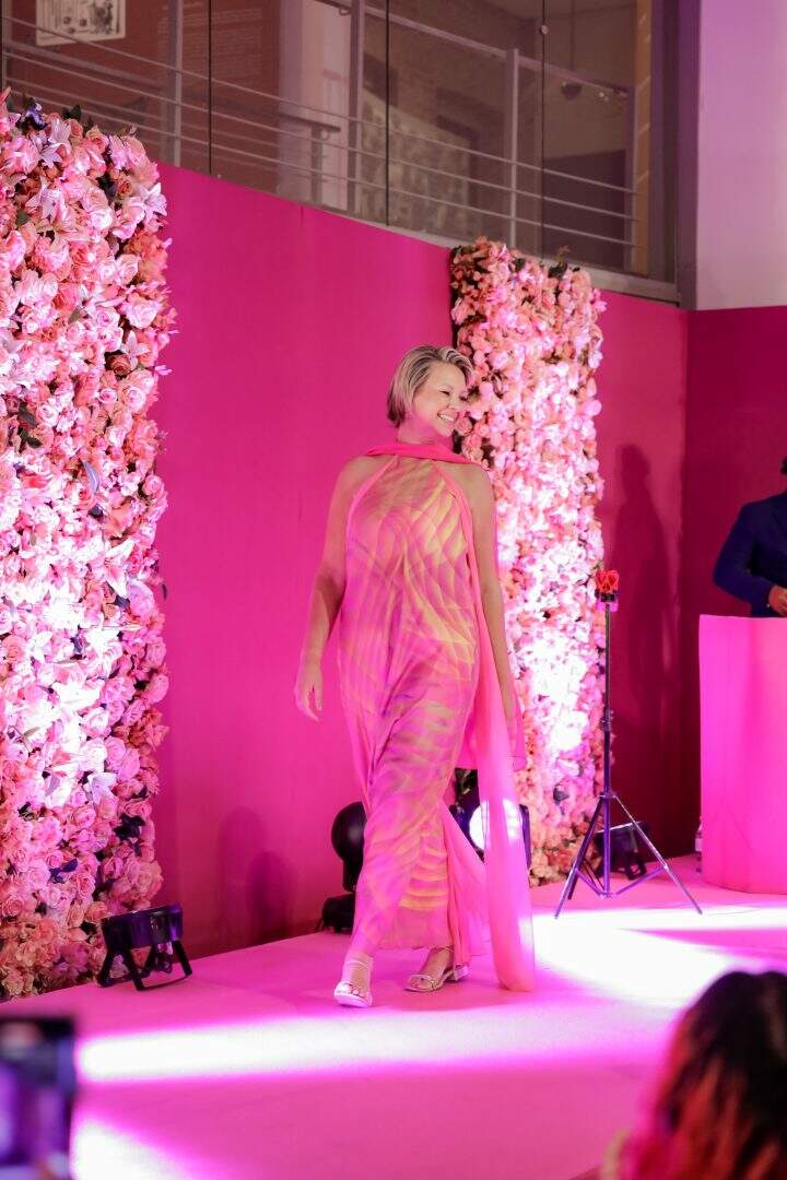 Dez mulheres que venceram o câncer de mama subiram à passarela com muita cor e peças esvoaçantes, representando a coragem e a autoestima de quem superou grandes desafios.