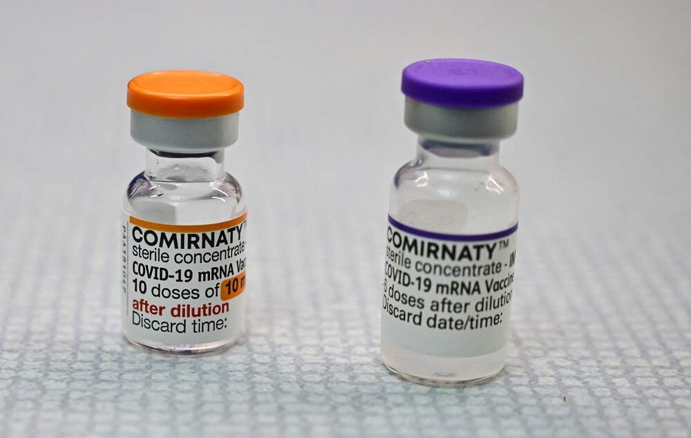Frascos da vacina da Pfizer em versão pediátrica (laranja) e a partir dos 12 anos (roxa).