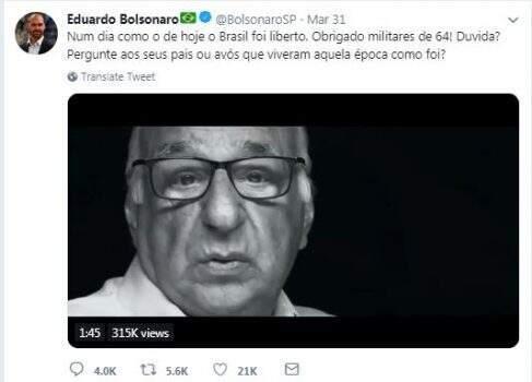 No domingo (31), 55 anos após o presidente João Goulart ser destituído do governo, o deputado federal Eduardo Bolsonaro e um dos canais oficiais de comunicação do Palácio do Planalto compartilharam um vídeo em comemoração a 1964. Na mensagem, um homem afirma que: “Era, sim, um tempo de medo e ameaças, ameaças daquilo que os comunistas faziam, onde era imposto sem exceção. Prendiam e matavam seus próprios compatriotas. Havia, sim, muito medo no ar”.