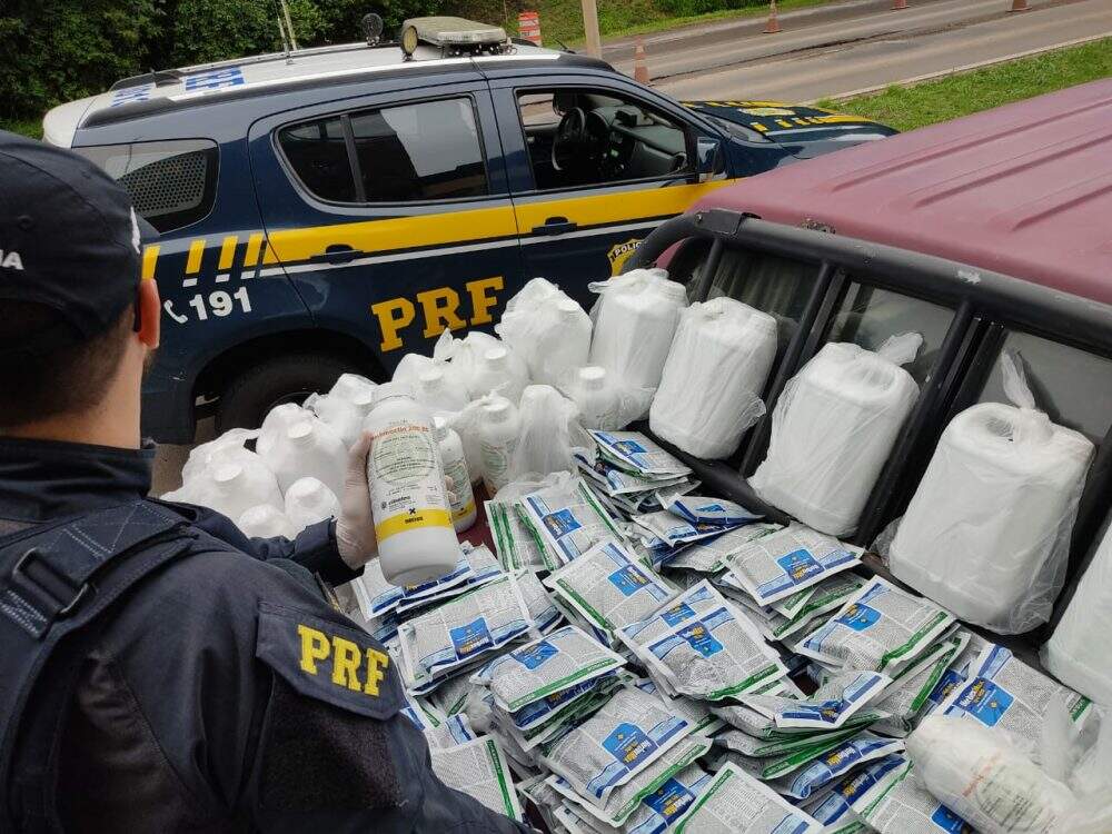 Na madrugada deste sábado (19), na BR-158 em Santa Maria, na Região Central do Estado, a PRF (Polícia Rodoviária Federal) aprendeu quase 100 litros e 30 quilos de agrotóxicos contrabandeados do Uruguai, que estavam sendo transportados em um fundo falso de uma F1000.