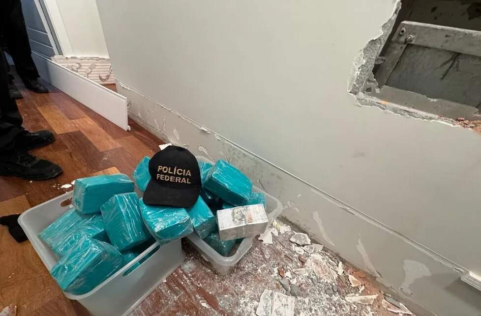 As imagens feitas na operação em que a parede falsa foi descoberta mostram pacotes fechados, que segundo a polícia, contém dinheiro em espécie. Na mesma imagem é possível ver um pacote transparente com parte dos dólares.