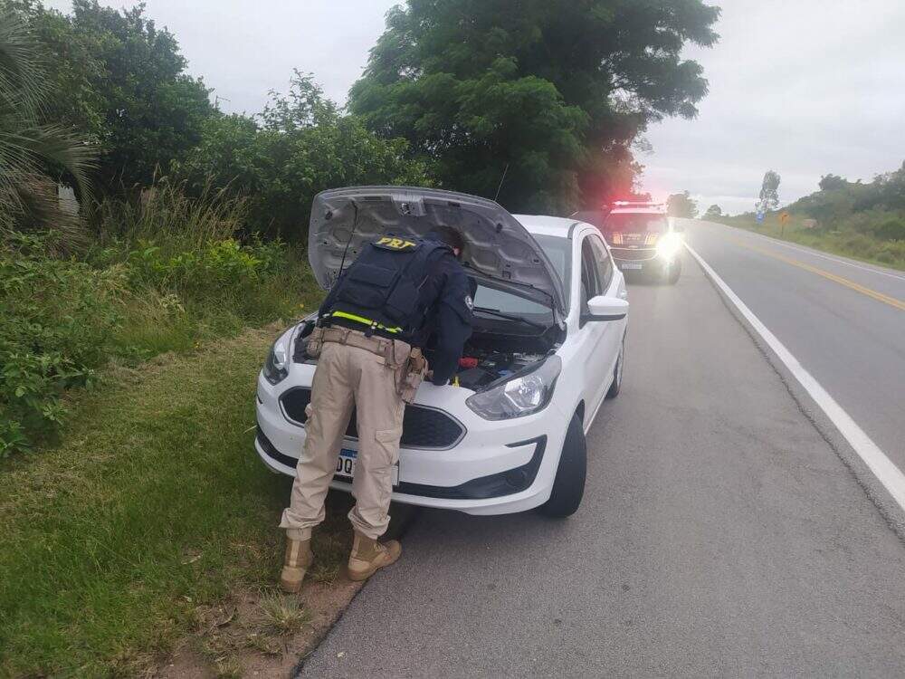 Em ação de fiscalização e combate ao crime, os policiais abordaram um Ka com placas de Araucária-PR. A abordagem ocorreu na BR-116. Durante a fiscalização, os agentes constataram que as placas de identificação eram falsas e que o número do chassi estava adulterado.