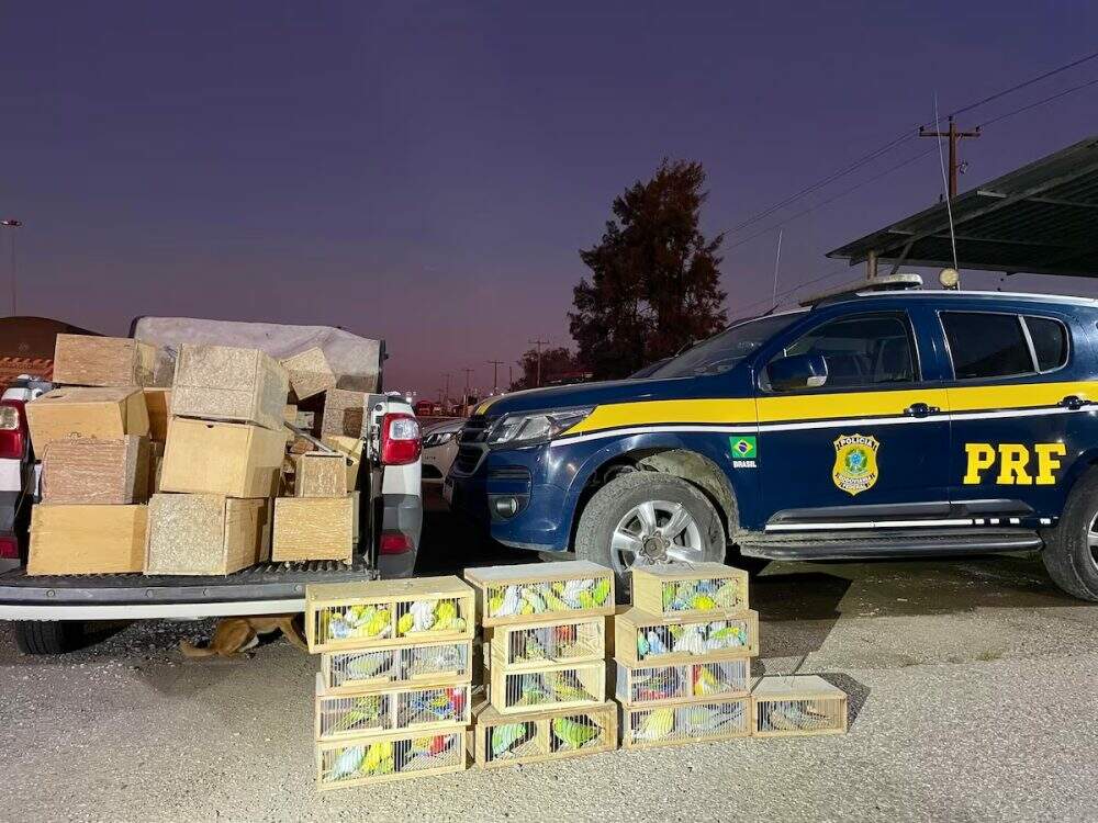A Polícia Rodoviária Federal (PRF) encontrou e resgatou cerca de 115 pássaros exóticos que estavam sendo transportados ilegalmente em gaiolas, dentro de caixas de papelão, na caçamba de uma caminhonete. O caso aconteceu na BR 293, em Bagé.