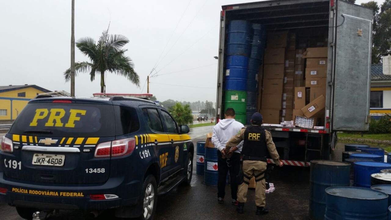 A PRF (Polícia Rodoviária Federal) apreendeu cerca de 500 mil maços de cigarros contrabandeados do Paraguai nesta manhã na BR 116, em Pelotas. Após receber denúncias de que um caminhão-baú estava cometendo diversas infrações de trânsito, policiais rodoviários abordaram o veículo em frente à unidade operacional de Pelotas. Ao revistarem o caminhão, flagraram os cigarros escondidos atrás de tonéis que continham inscrições e adesivos de produtos perigosos.