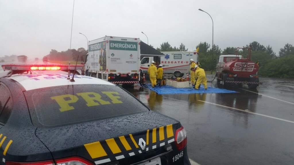 A PRF (Polícia Rodoviária Federal) realizou, na manhã desta terça-feira (2), um simulado de acidente com produto perigoso no km 65 da Freeway (BR 290), no sentido litoral-capital.