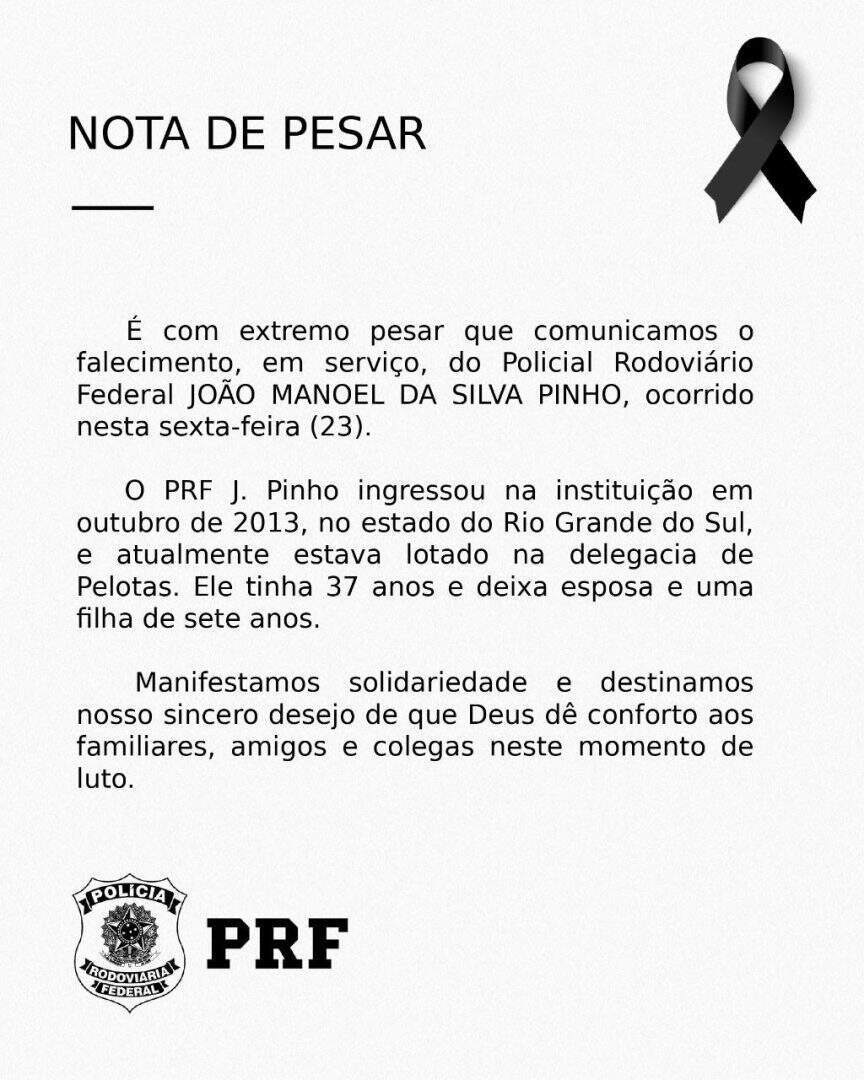 O policial rodoviário federal João Manoel da Silva Pinho, de 37 anos, morreu atropelado ao tentar abordar um veículo na BR-116, em São Lourenço do Sul, na tarde de sexta-feira (23).
