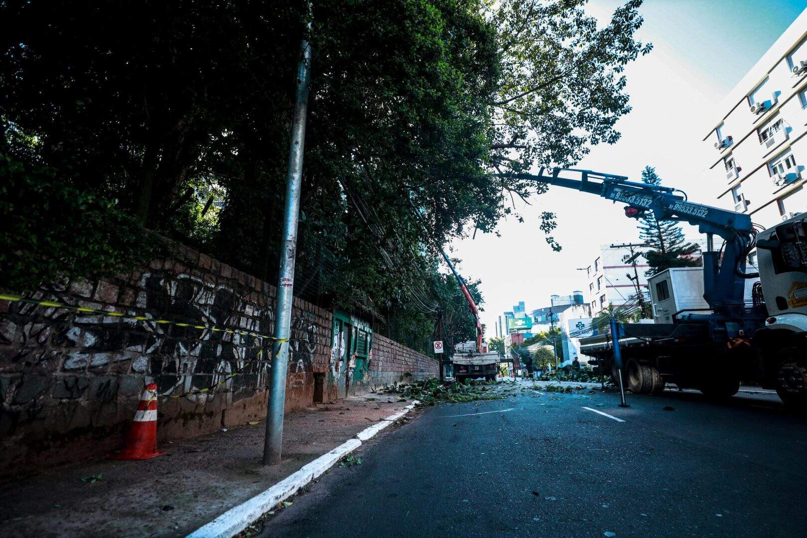 As equipes estão realizando a retirada dos troncos das árvores de grande porte das espécies falsa-seringueira e paineira. Inicialmente, o estudo prévio apontou a necessidade de remoção de três árvores, mas as equipes contratadas pela Secretaria Municipal de Serviços Urbanos (SMSUrb) identificaram um quarto vegetal com risco de queda, que também foi removido.