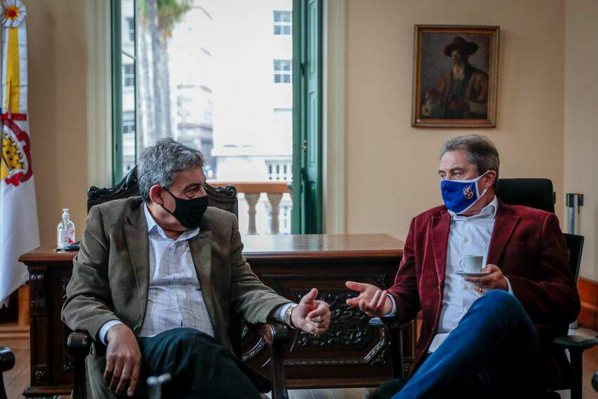 Prefeito Melo (E) abre diálogo para viabilizar a realização da final da Libertadores na Capital, em 2022. (Foto: Alex Rocha/PMPA)