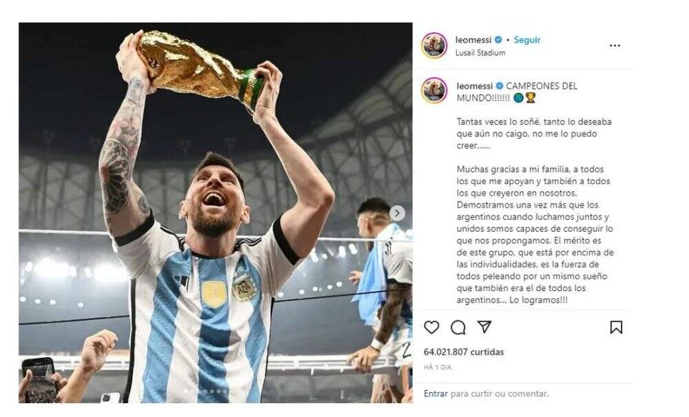 O Instagram anunciou nesta terça-feira (20) que a foto publicada pelo atacante argentino Messi com a taça da Copa do Mundo se tornou a mais curtida de todos os tempos na plataforma. Ao todo, o post tem 10 fotos e alcançou mais de 64 milhões de curtidas.