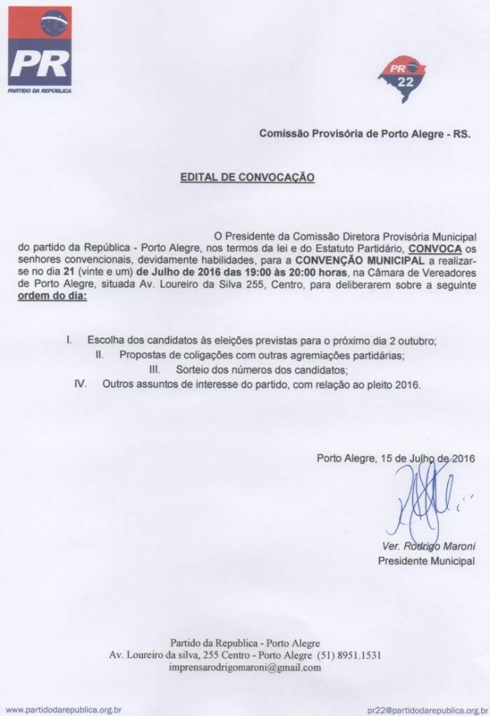 A Convenção Municipal do PR (Partido da República) será realizada na quinta-feira (21), das 19h às 20h, na Câmara de Vereadores de Porto Alegre. No encontro, serão definidas as alianças e as candidaturas para as eleições municipais deste ano na Capital.