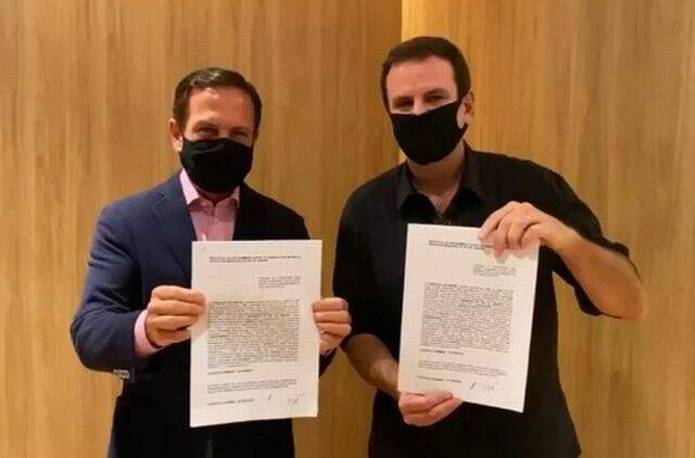 João Doria (PSDB) e Eduardo Paes (DEM) mostram páginas do acordo assinado.