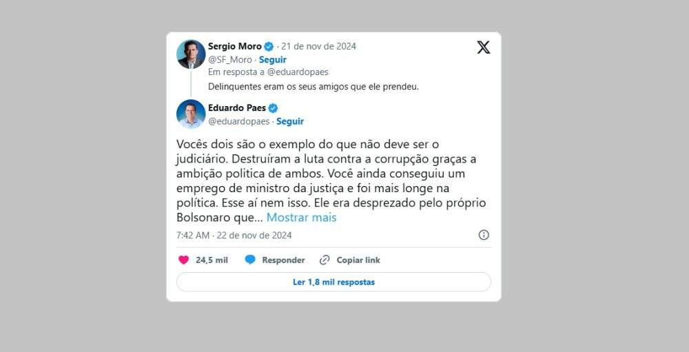 Paes rebateu: “Vocês dois são o exemplo do que não deve ser o Judiciário. Destruíram a luta contra a corrupção graças a ambição politica de ambos. Você ainda conseguiu um emprego de ministro da Justiça e foi mais longe na política. Esse aí nem isso. Ele era desprezado pelo próprio Bolsonaro que fez uso eleitoral das posições dele. E quem me disse isso foi o próprio ex-presidente. Recolha-se a sua insignificância. Aqui você não cresce! Lixo!”
