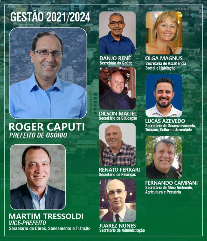 O prefeito eleito de Osório, Roger Caputi (MDB), anunciou oficialmente na terça-feira (29), ao lado do seu vice, Martim Tressoldi (PSDB), os secretários que irão compor oito pastas na sua gestão.