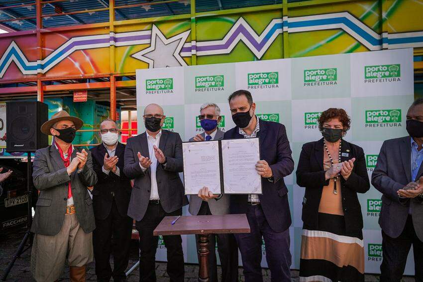 Foto: PMPA/DivulgaçãoO prefeito de Porto Alegre em exercício, Ricardo Gomes, assinou nesta quinta-feira (16), no Largo Glênio Peres, um decreto que permite que a operação de ônibus de turismo, como o Linha Turismo, seja feita por empresas privadas.