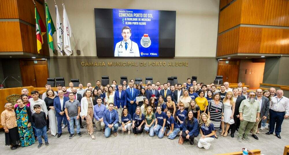 A Faculdade de Medicina da Ulbra Porto Alegre recebeu a Comenda Porto do Sol, a mais alta honraria da Câmara Municipal, em sessão realizada no Plenário Otávio Rocha. A homenagem, proposta pelo vereador Alexandre Bobadra e aprovada por unanimidade, reconhece o papel da instituição na formação de médicos e cidadãos comprometidos com a comunidade. O vice-presidente João Pedro Melke destacou a disciplina de saúde da família presente em todos os semestres e os milhões de atendimentos já realizados. Para Bobadra, a Ulbra é referência pela estrutura moderna e corpo docente qualificado. O superintendente Ruy Irigaray lembrou que médicos egressos atuam em todo o país e em centros internacionais, reforçando o impacto da universidade.