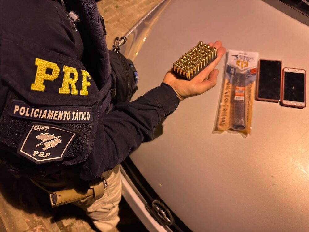 Um dos policiais abriu a porta traseira do carro para auxiliar a criança a colocar o cinto de segurança e o dispositivo de retenção de forma adequada e se deparou com uma pequena sacola de papel cheia de munições. No total havia no veículo 50 munições 9mm, calibre de uso restrito, além de um carregador para 32 munições também 9mm.