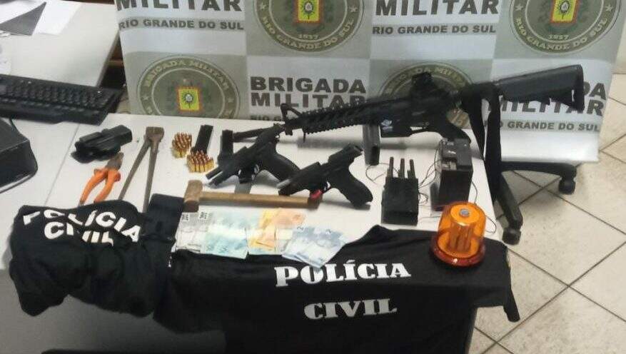 Com os bandidos, foram apreendidos duas pistolas, um carregador, uma réplica de fuzil T4 Airsoft, um bloqueador de sinal, um martelo, um celular, dois alicates torquês, dois televisores, 52 munições intactas e R$ 736. Um dos indivíduos, que apresentava ferimentos de arma de fogo, foi encaminhado ao Hospital Dom João Becker. Nenhum policial ficou ferido.