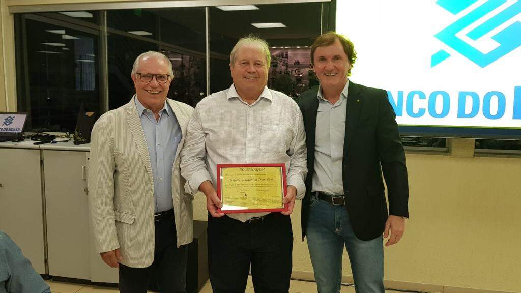 Em evento realizado em Porto Alegre na noite de terça-feira, 26/3, o presidente da Cotrijal, Nei César Manica, foi homenageado pela Confraria Senadinho e pelo Banco do Brasil. O momento reuniu autoridades e lideranças estaduais que integram a confraria e também os superintendentes do banco no Rio Grande do Sul.