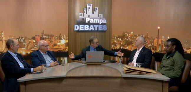 O ex-jogador Hugo de Léon, o presidente do Grêmio, Romildo Bolzan Junior, o apresentador Paulo Sérgio Pinto, o presidente do Internacional, Marcelo Medeiros, e o ex-jogador Tinga no Pampa Debates.