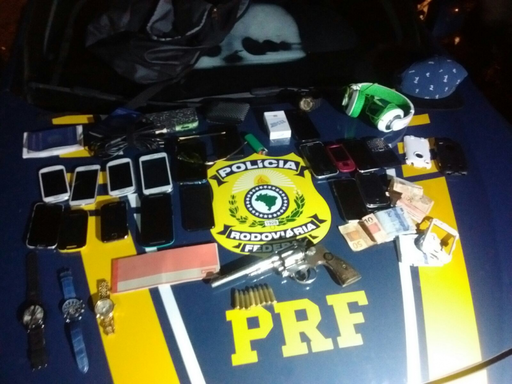 Ao efetuarem a abordagem, localizaram com os mesmos um revólver calibre 38 municiado com 6 cartuchos, cerca de 30 celulares, vários relógios além de uma grande quantia em dinheiro, tudo roubado das vítimas que estavam no ônibus.