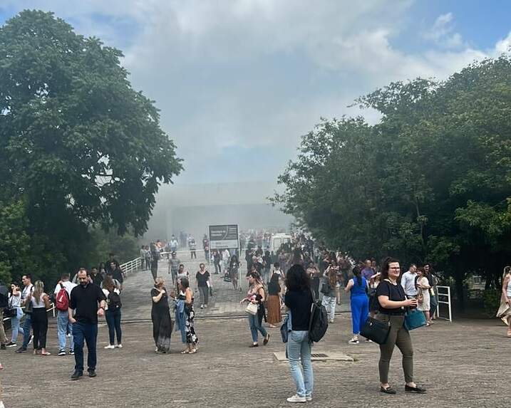 As pessoas que estavam no edifício deixaram o local depois que o alarme de incêndio disparou