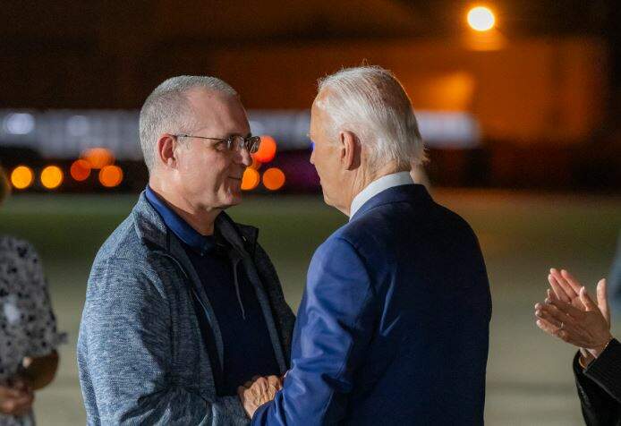 O jornalista Evan Gershkovich, o ex-fuzileiro naval Paul Whelan e a jornalista Alsu Kurmasheva, que estavam presos na Rússia e foram libertados, chegaram aos Estados Unidos e foram recebidos pelo presidente Joe Biden e pela vice-presidente Kamala Harris na base militar de Andrews, próxima a Washington na última quinta-feira (1°).