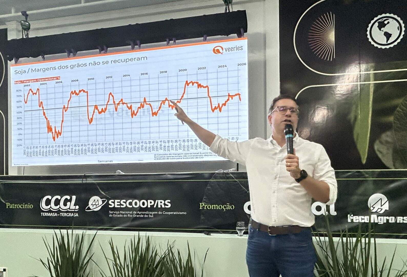 Na palestra “2026: O Novo Ciclo da Soja e do Milho: entre safras recordes e mudanças na demanda”, Rubin apresentou números e ferramentas voltados à análise do mercado agrícola. Ele exibiu dados sobre o desempenho da soja nos últimos anos e apontou que a produtividade gaúcha tem ficado abaixo da média observada em outros estados. Segundo Rubin, fatores climáticos têm contribuído para esse cenário. “Além do clima tem sobrado menos dinheiro para investir em novas safras”, ressaltou.