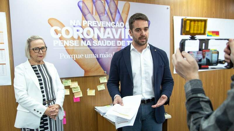 Governador Leite e a secretária da Saúde, Arita Bergmann, na transmissão pela internet direto do Gabinete de Crise da Covid-19.