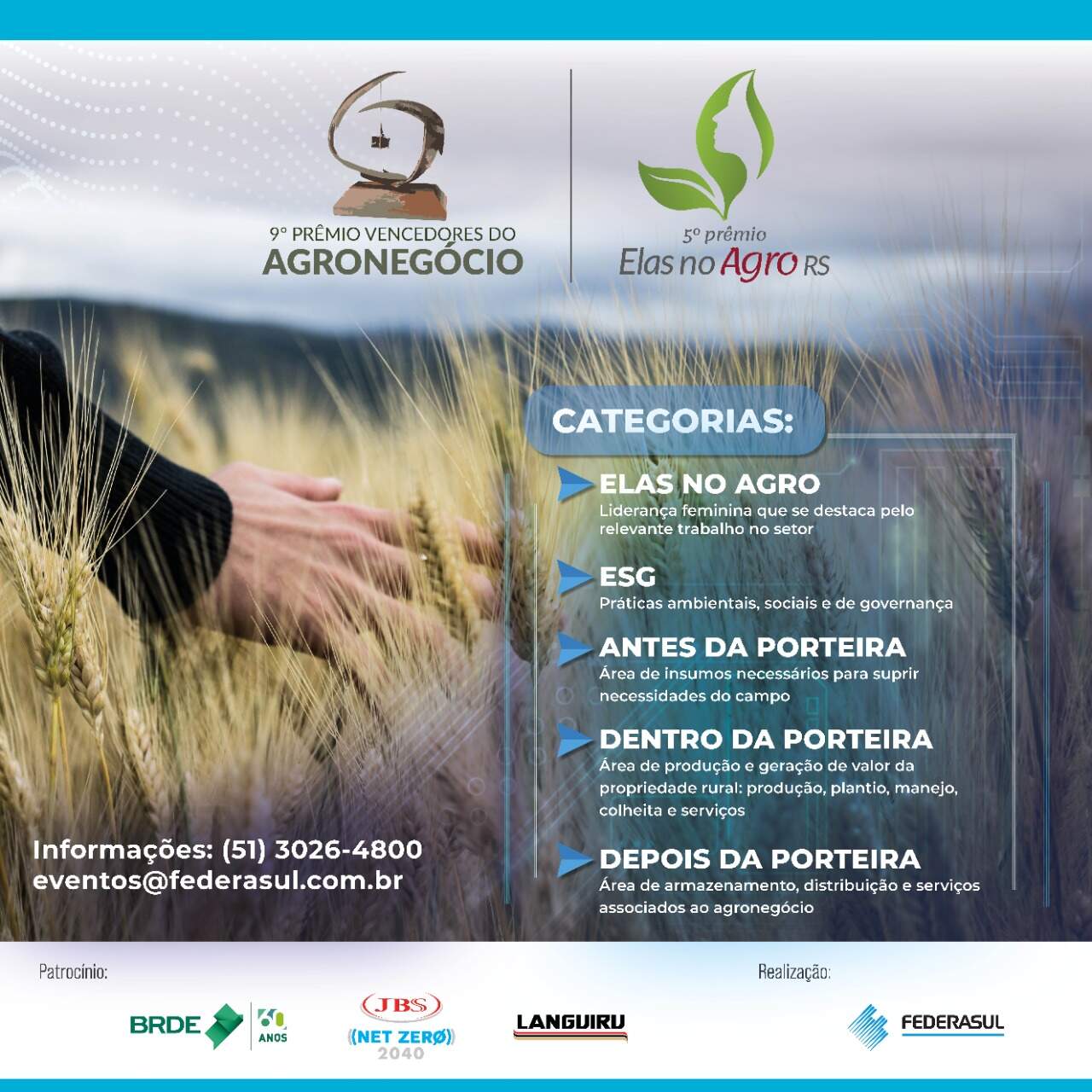 Foto: DivulgaçãoEstão abertas até o dia 15 de agosto as inscrições para o 9º Prêmio Vencedores do Agronegócio e o 5º Prêmio Elas no Agro, promovidos pela Federasul (Federação das Entidades Empresariais do Rio Grande do Sul).