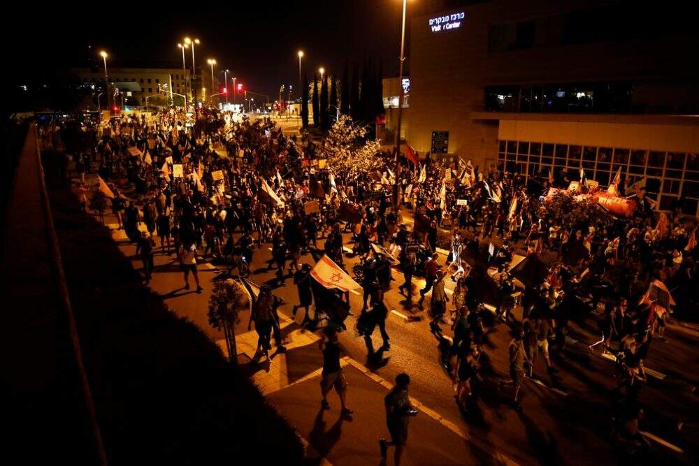 Manifestantes fizeram um ato na capital de Israel com críticas ao primeiro-ministro Benjamin Netanyahu no sábado (12). Segundo a imprensa local, o ato reuniu mais de 10 mil pessoas e ocorreu em frente à residência de Netanyahu. Protestos semelhantes aconteceram em outras semanas.