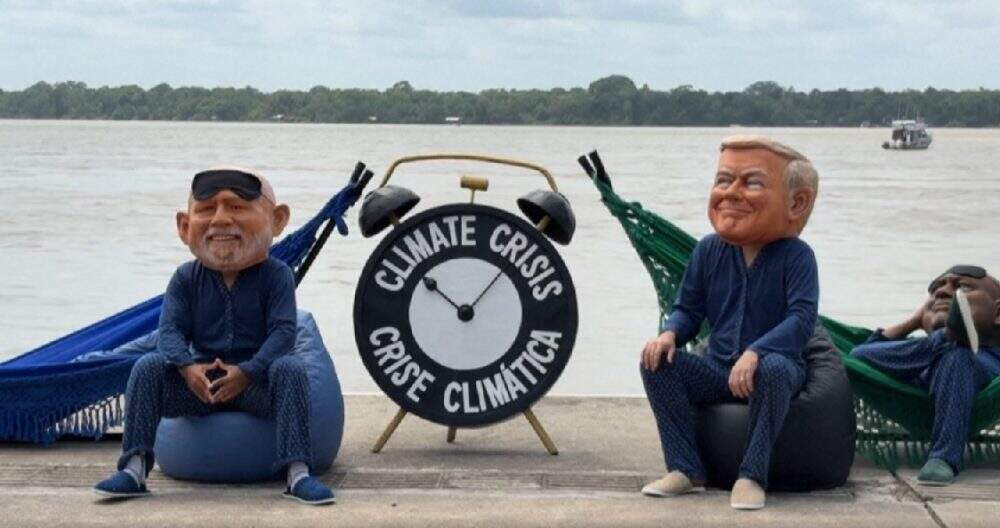 Um grupo de ativistas realizou na manhã de quarta-feira (5) um protesto em Belém do Pará contra o que consideram uma demora das autoridades para combater a crise climática. Os integrantes da ONG Oxfam, de combate à desigualdade e à pobreza, simularam líderes mundiais, como os presidentes Luiz Inácio Lula da Silva (Brasil) e Donald Trump (EUA), descansando e relaxando em meio à paisagem da capital paraense.