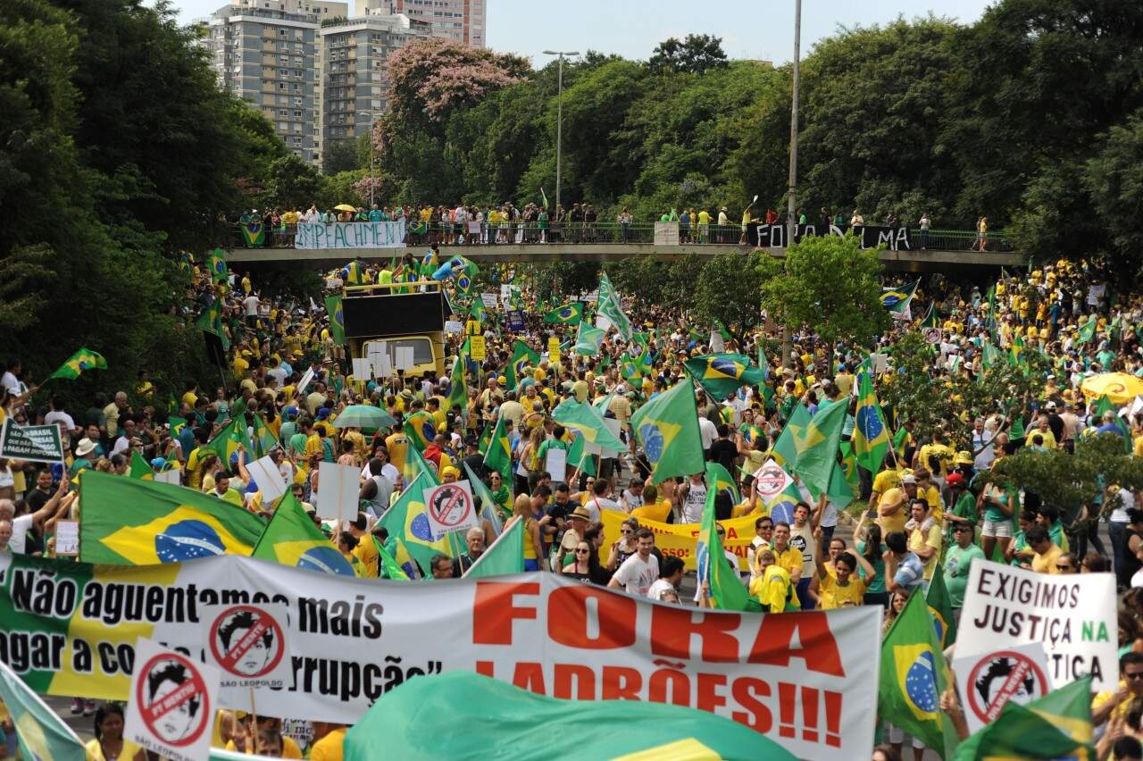 Protestos contra a presidenta Dilma Rousseff ocorreram em mais de 200 cidades brasileiras neste domingo (16). As manifestações iniciaram por volta das 10h em municípios como Brasília, Rio de Janeiro, Belém (PA), Belo Horizonte (MG), Maceió (AL), Recife (PE), Juiz de Fora (MG), Ribeirão Preto (SP) e Mogi das Cruzes (SP). Em São Paulo, o ato foi realizado à tarde na avenida Paulista.