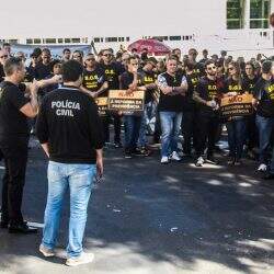 Protesto de municipários na esquina da avenida João Pessoa com a Ipiranga (Foto: Jackson Ciceri/O Sul)
