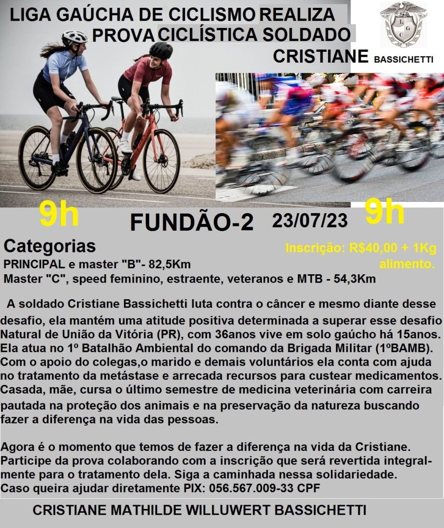 Foto: DivulgaçãoA Liga Gaúcha de Ciclismo realizará no domingo (23), no distrito de Itapuã, em Viamão, na Região Metropolitana de Porto Alegre, uma prova em prol da soldado Cristiane Bassichetti, do 1º Batalhão Ambiental da Brigada Militar, que luta contra um câncer agressivo.